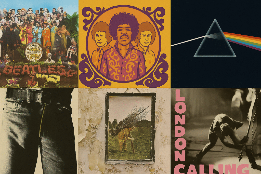 Você já reparou como, muitas vezes, uma capa fala mais do que mil riffs? Nos anos 60 e 70, quando o vinil era altar sagrado, a arte que embalava os discos não era apenas decoração: era manifesto, identidade e provocação. Algumas dessas imagens se tornaram tão famosas quanto as músicas que guardavam — viraram pôster em quarto de adolescente, símbolo de rebeldia em camisetas e até ícones pop que sobreviveram à passagem das décadas.